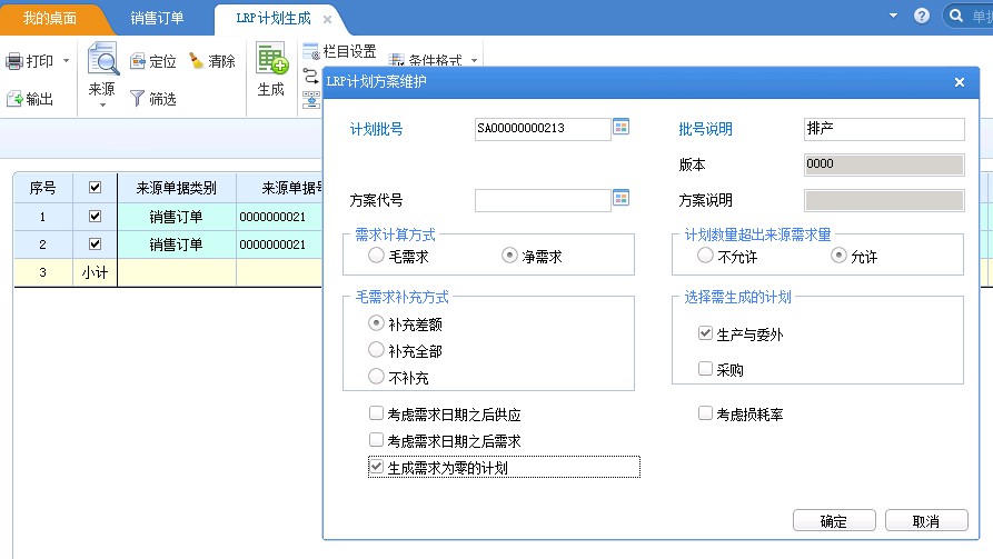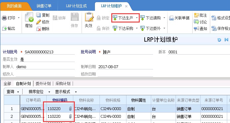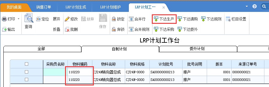 2.在LRP計(jì)劃作業(yè) - LRP計(jì)劃生產(chǎn)中查詢相應(yīng)銷售訂單,生成LRP生產(chǎn)計(jì)劃,在LRP計(jì)劃維護(hù)中聯(lián)查到相應(yīng)單據(jù)或者在LRP計(jì)劃工作臺(tái)查詢到相應(yīng)計(jì)劃,選擇需要下達(dá)生產(chǎn)的成品